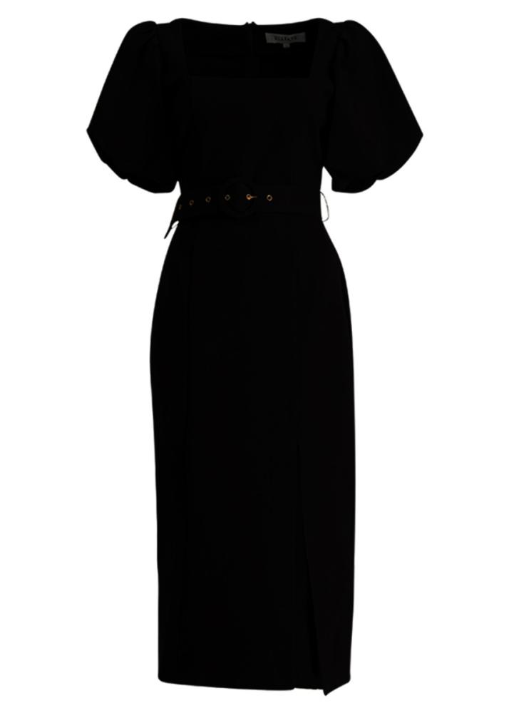 - Understated but not boring, Brynlee by Elliatt is a timeless piece. The calf grazing style has a slim silhouette boasting short puff sleeves and a column skirt that cinches in at the waist with a matching belt.
