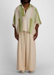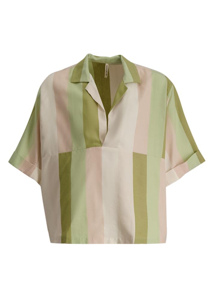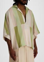 Variegated stripes adorn the loose, boxy silhouette of this polo shirt, a bespoke creation from Marrakshi Life. Its buttonless closure exudes laid-back elegance, while an extended camp shirt collar encapsulates a sense of polished aesthetics.