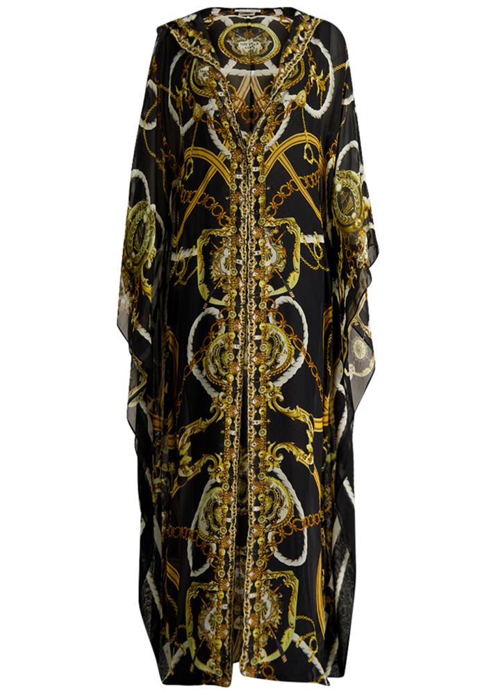 - In breezy silk chiffon, the Coast To Coast robe by Camilla navigates a sea inspired realm with gilded chains and nautical notes. The draped statement sleeves cascade into an elegantly shaped maxi silhouette, while the hood descends into shimmering neckbands.