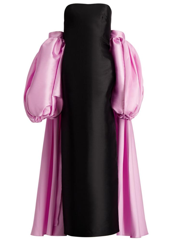 - The striking aesthetic of Solace London is embodied in the Lea column gown, an artful manifestation where the strapless silhouette is punctuated by voluminous puff sleeves in contrasting pink satin cascading into a cape like train.