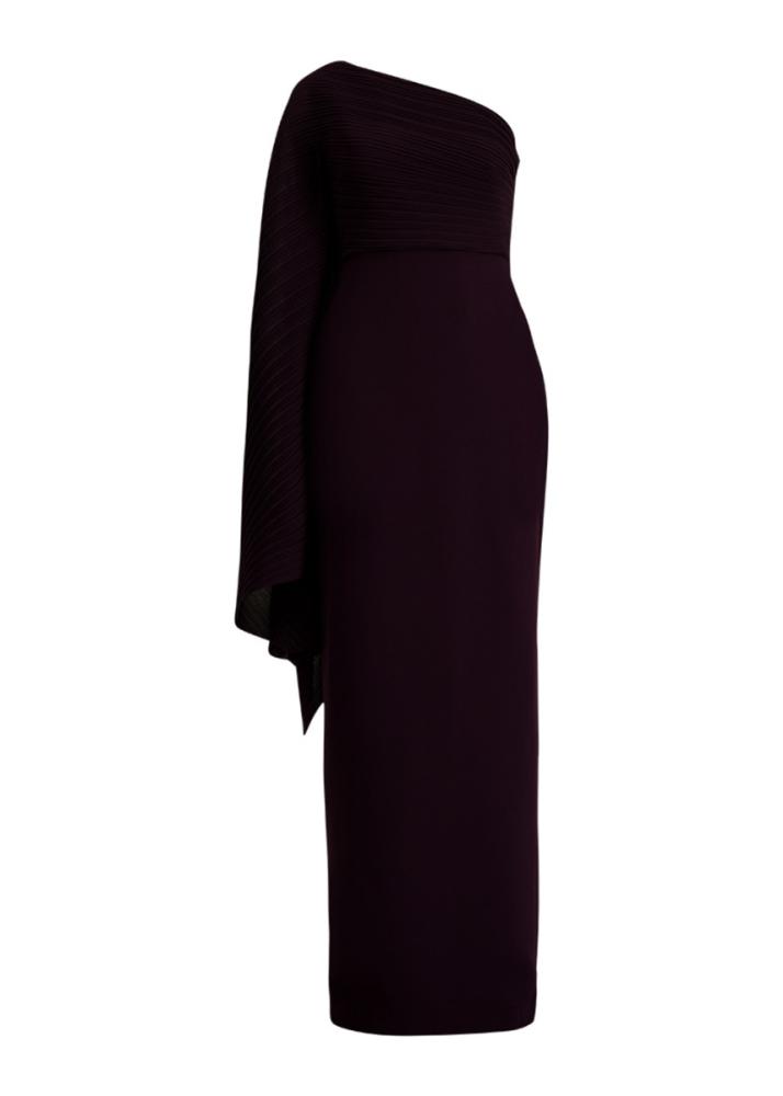 - The Lillia gown by Solace London is a captivating embodiment of contemporary femininity, featuring a sleek column skirt in crepe detailed with a subtle back split and a one shoulder ribbed cape bodice.