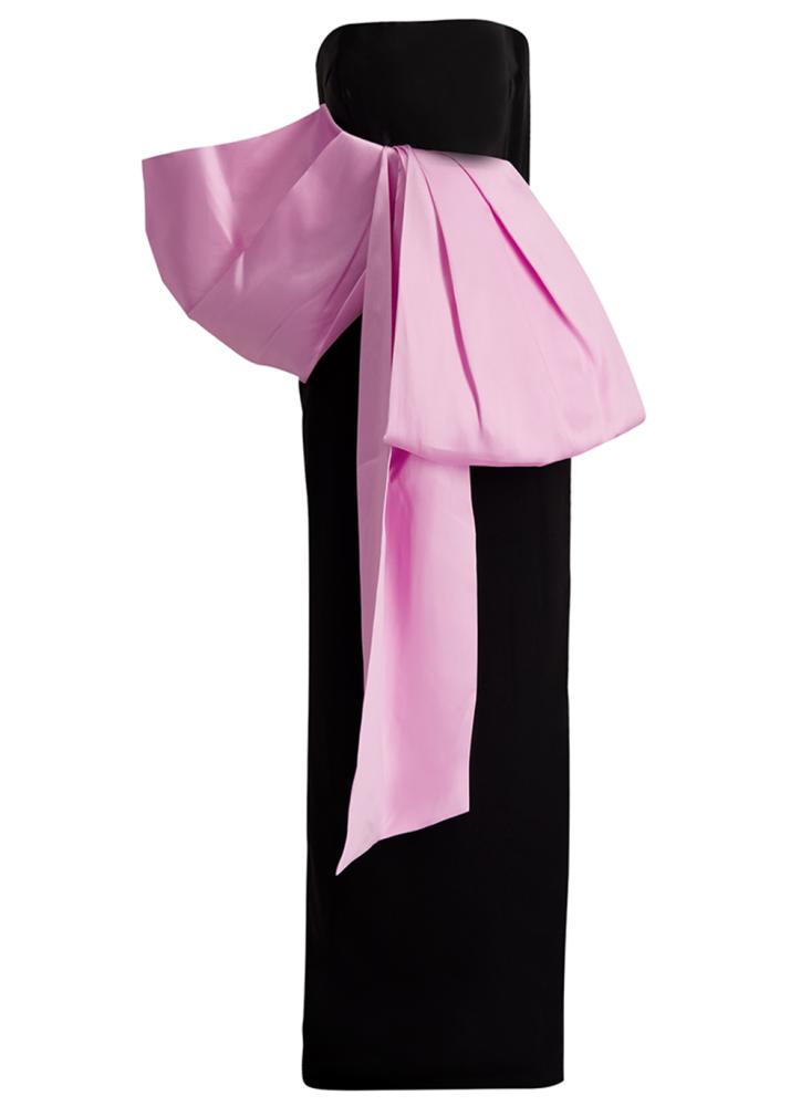 - The Maeve column gown from Solace London proudly presents a sleek strapless silhouette accentuated by an oversized bow in contrasting satin gracing the front, embodying the unmistakable penchant for striking aesthetics.