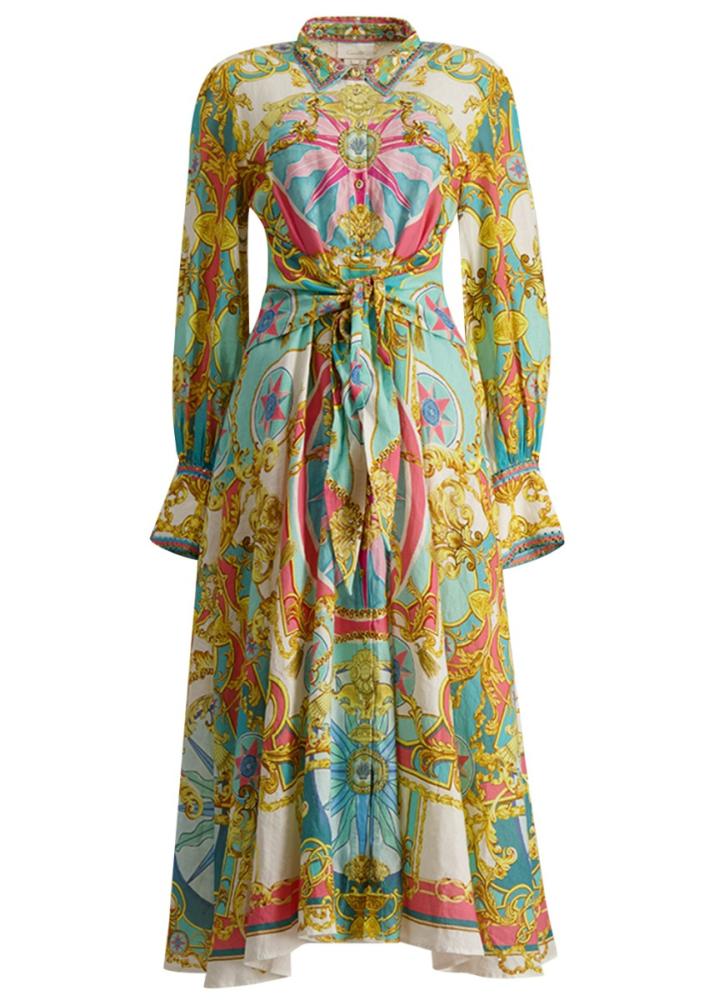- Draped in a vibrant seascape of nautical notes and golden treasures, the Sail Away With Me midi dress by Camilla features a timeless silhouette boasting a shirt collar, button through front, waist cinching tie detail, and an elegant a line skirt.