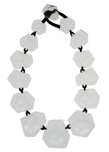 The Nocte necklace by Monies showcases a fusion of artistry and unconventional design, with oversized geometric beads meticulously cut from acrylic, connecting through a leather strap for a chunky statement.