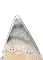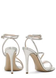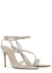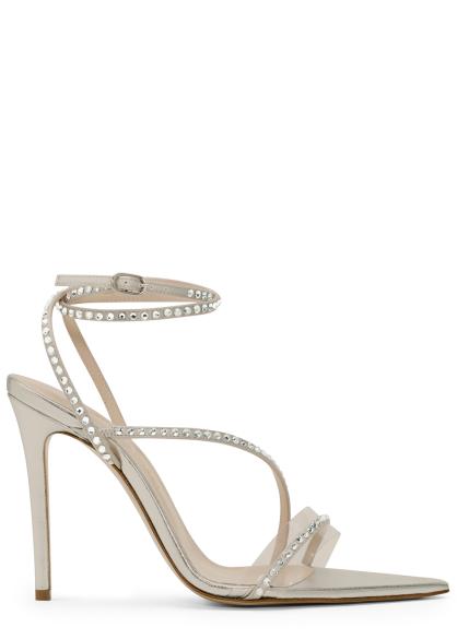 The Dassy sandal from Andrea Wazen boasts a pointed-toe silhouette in silver metallic leather. Dazzling crystals adorn the sleek straps, while a towering heel is added for an irresistibly chic stride.