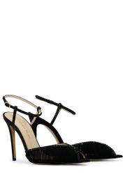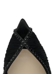 The Katy sandal by Andrea Wazen is presented in a pointed-toe silhouette. Pleated tulle lined with shimmering crystals wraps the vamp, adding a touch of enchanting sophistication to every step.