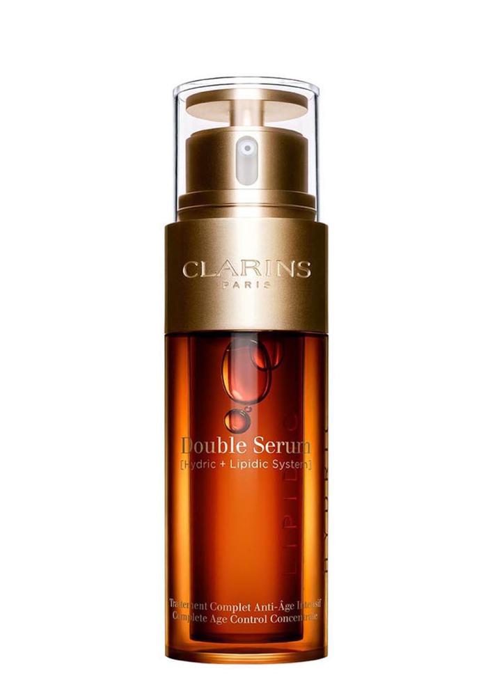 - Clarins Double Serum 30ml or 50ml is a Complete Age Control Concentrate formulated to help work on the 5 vital skin functions for visibly younger looking skin. Clarins Double Serum acts on the appearance of major signs of skin-aging and contains 21 active plant extracts, including turmeric. Turmeric is renowned for its exceptional anti-aging properties. The bottles rotating push button delivers a made-to-measure dosage of serum. Skin is left looking more radiant, firmer, and fine lines are smoothed.